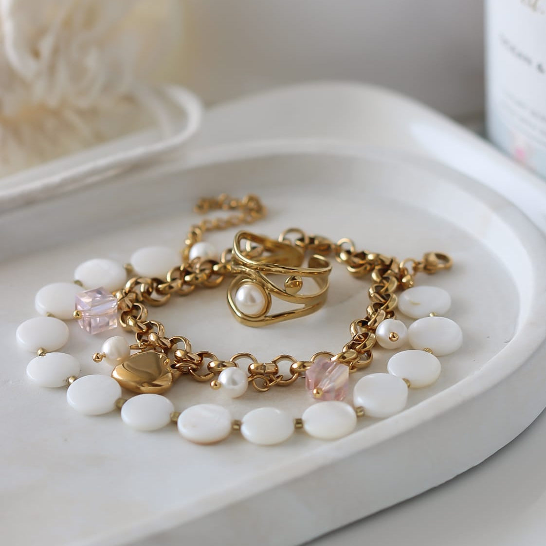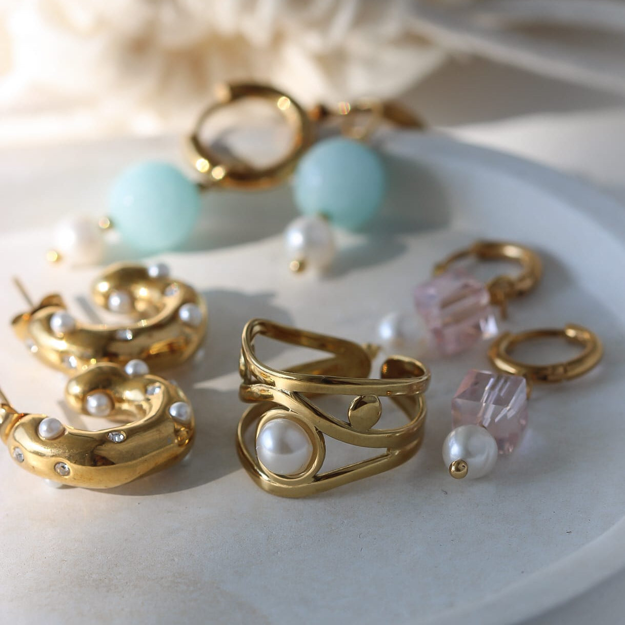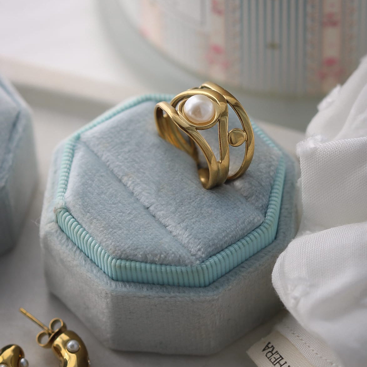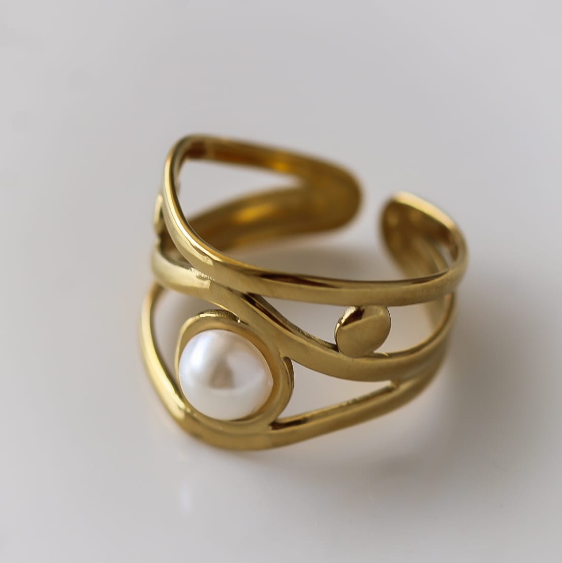 Vergoldeter Ring aus Edelstahl mit einer zarten Perle im Mittelpunkt in modernem, offenem Design. Ein elegantes Schmuckstück mit zeitloser Ausstrahlung, das jedem Look eine feine, feminine Note verleiht.