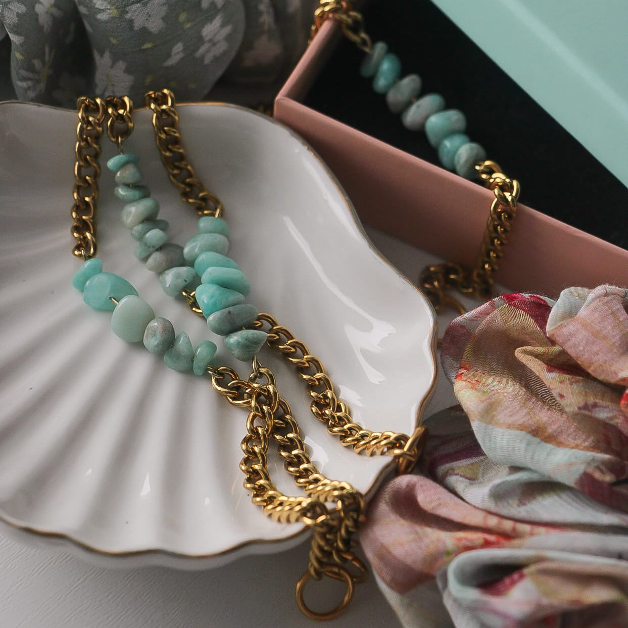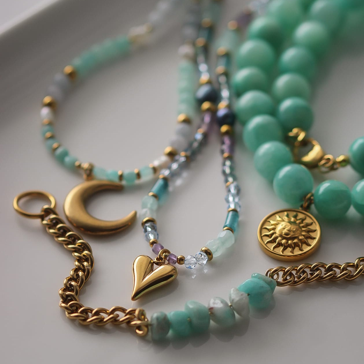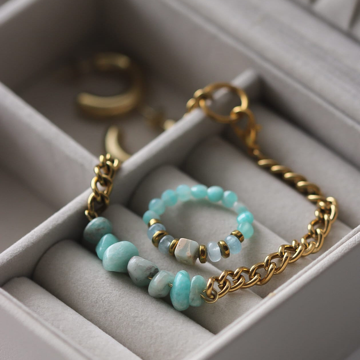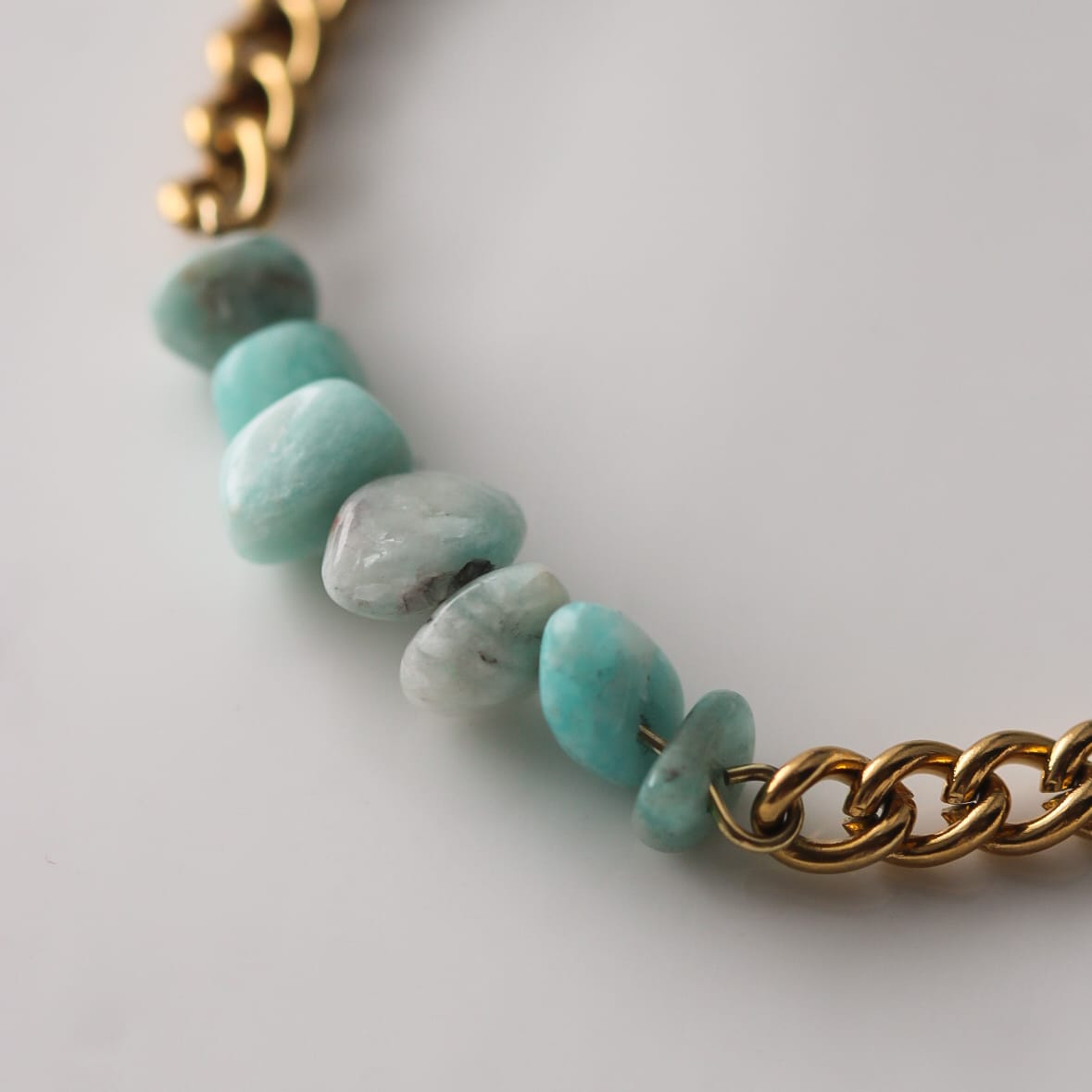 Armband aus vergoldetem Edelstahl mit Amazonit-Perlen – in sanften Blau-Grün-Tönen, die jedem Look einen frischen Akzent geben.