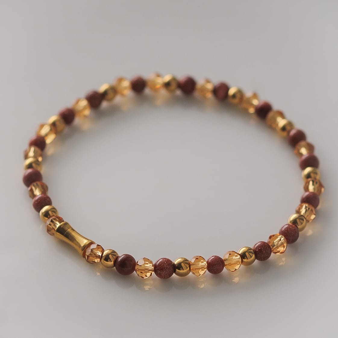 Elastisches Armband mit kleinen 4 mm Goldfluss-Steinen, Glaskristallen und vergoldeten Edelstahl-Elementen. Das Armband ist circa 16 cm lang .