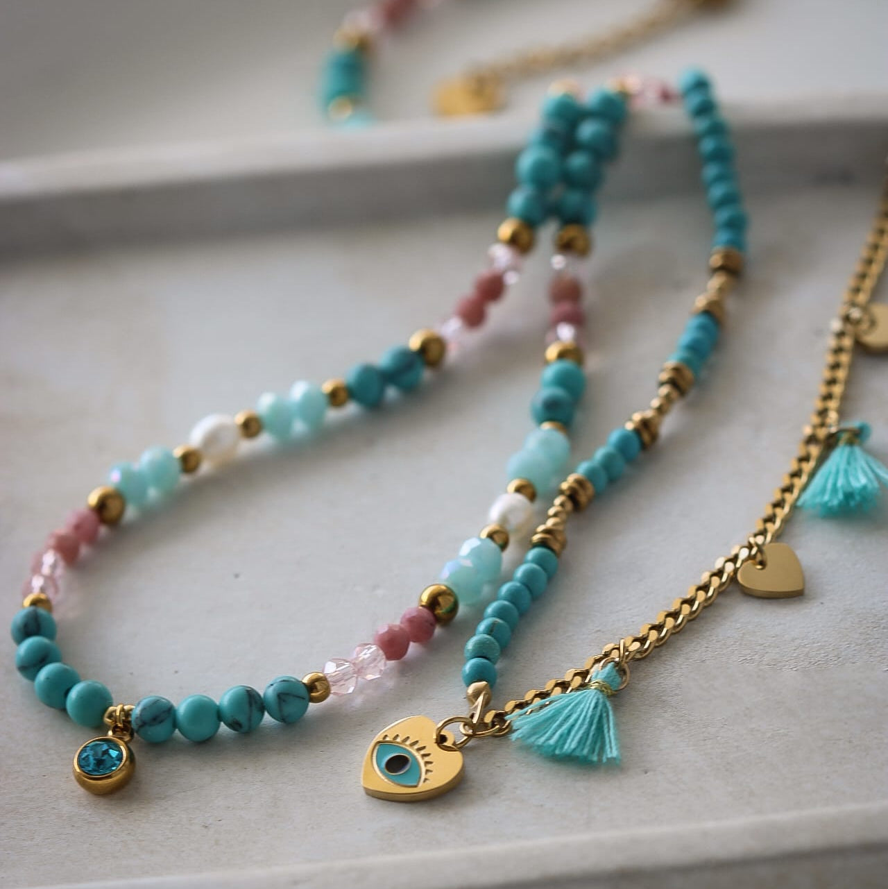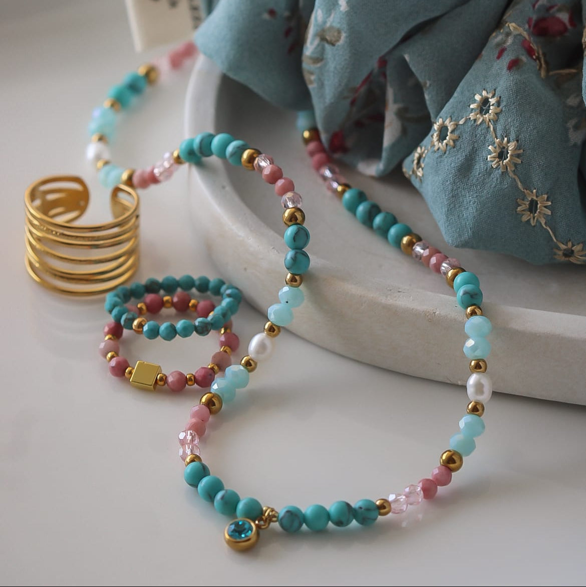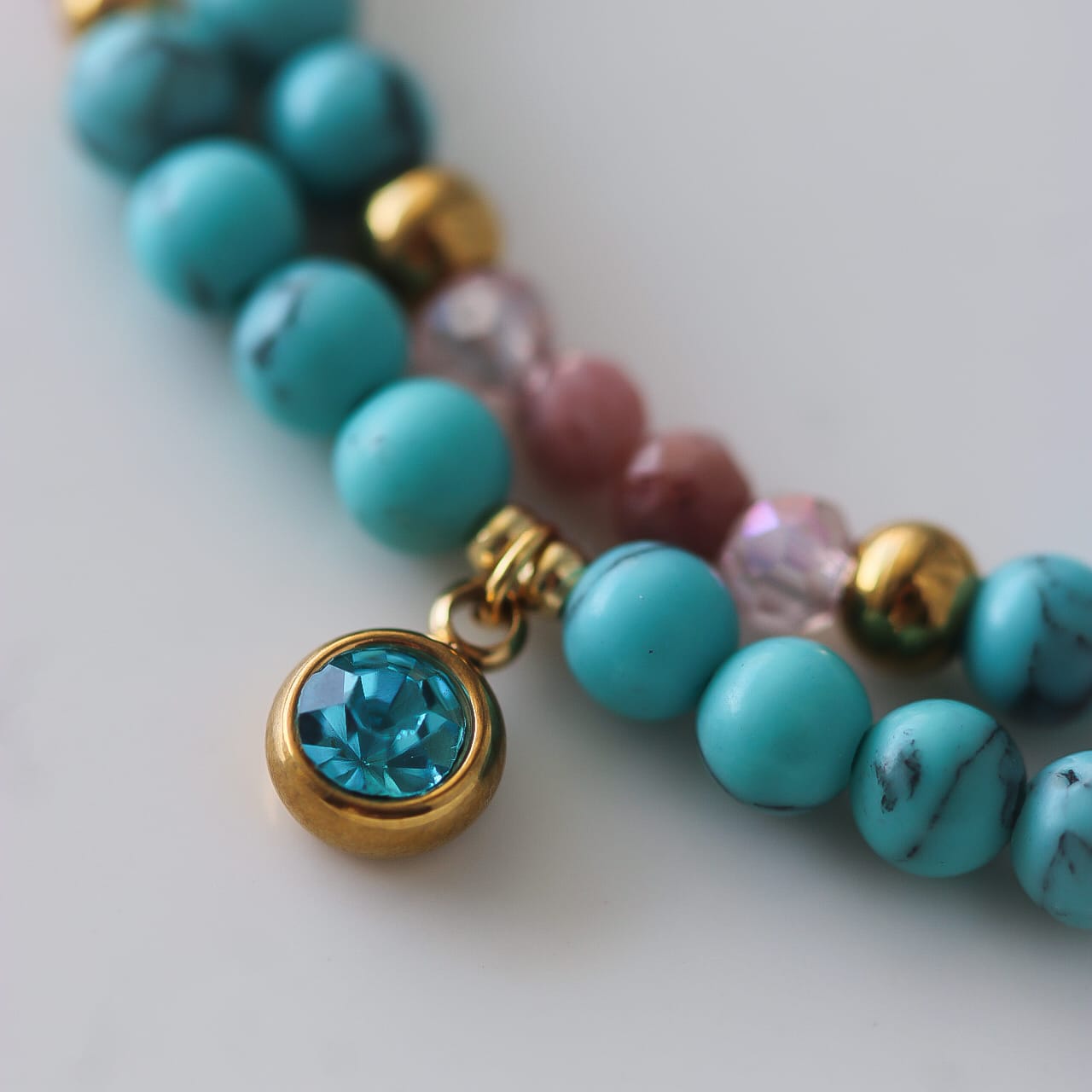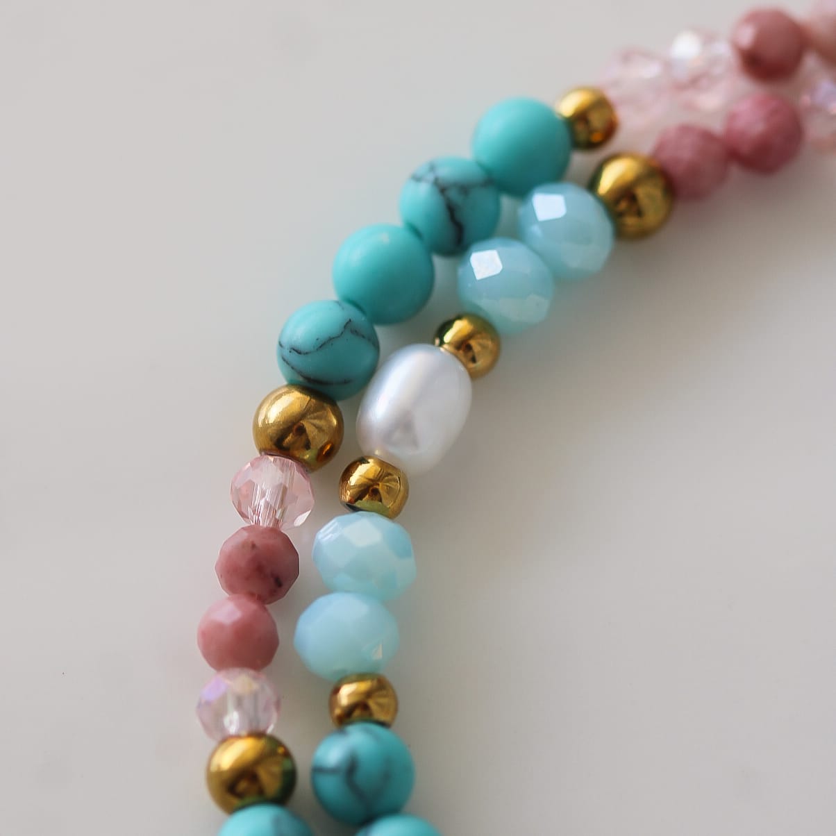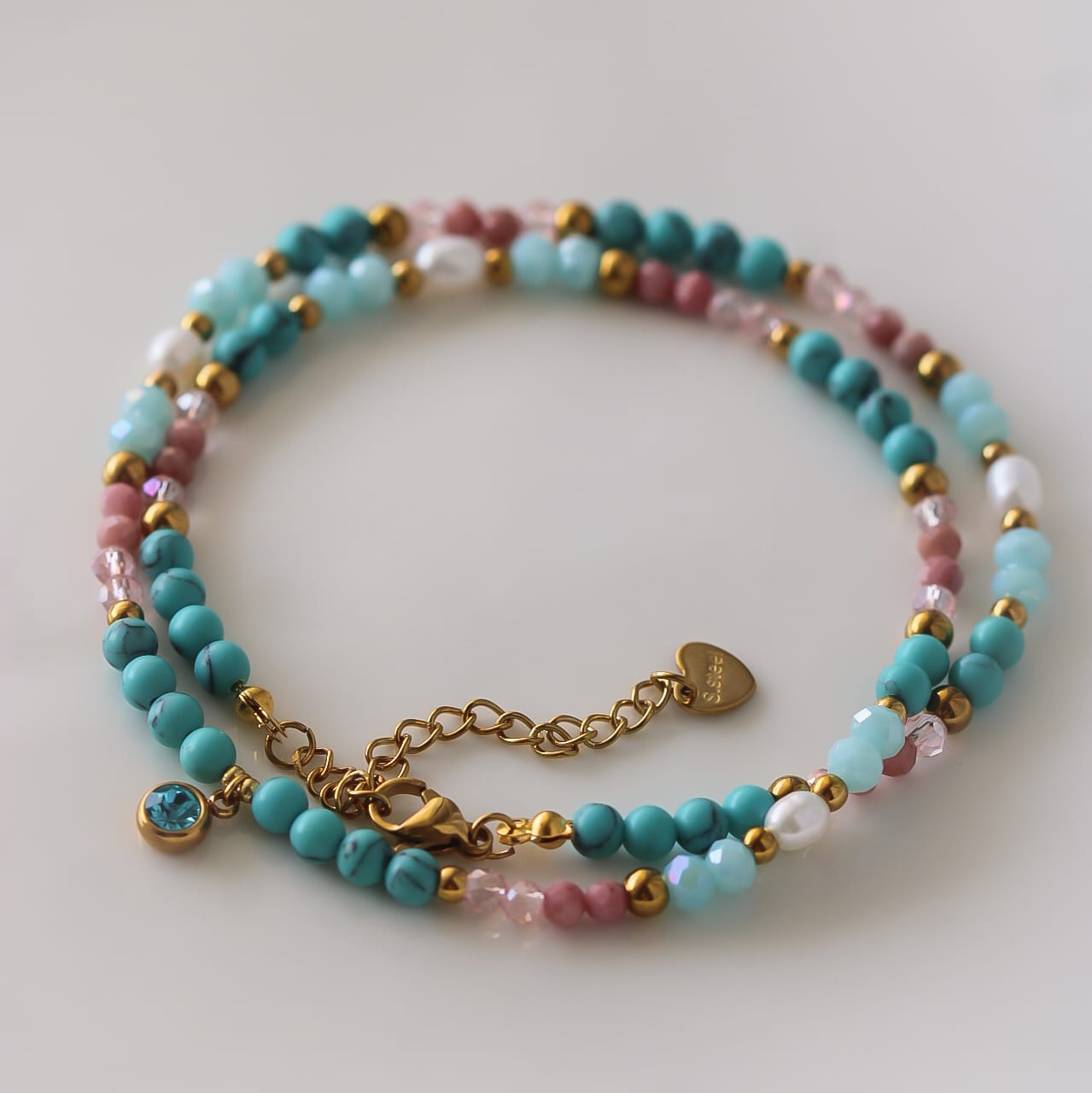 Material: Türkis, Rhodonit, vergoldeter Edelstahl, natürliche Perlen