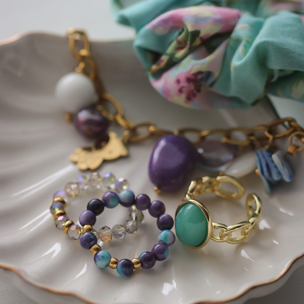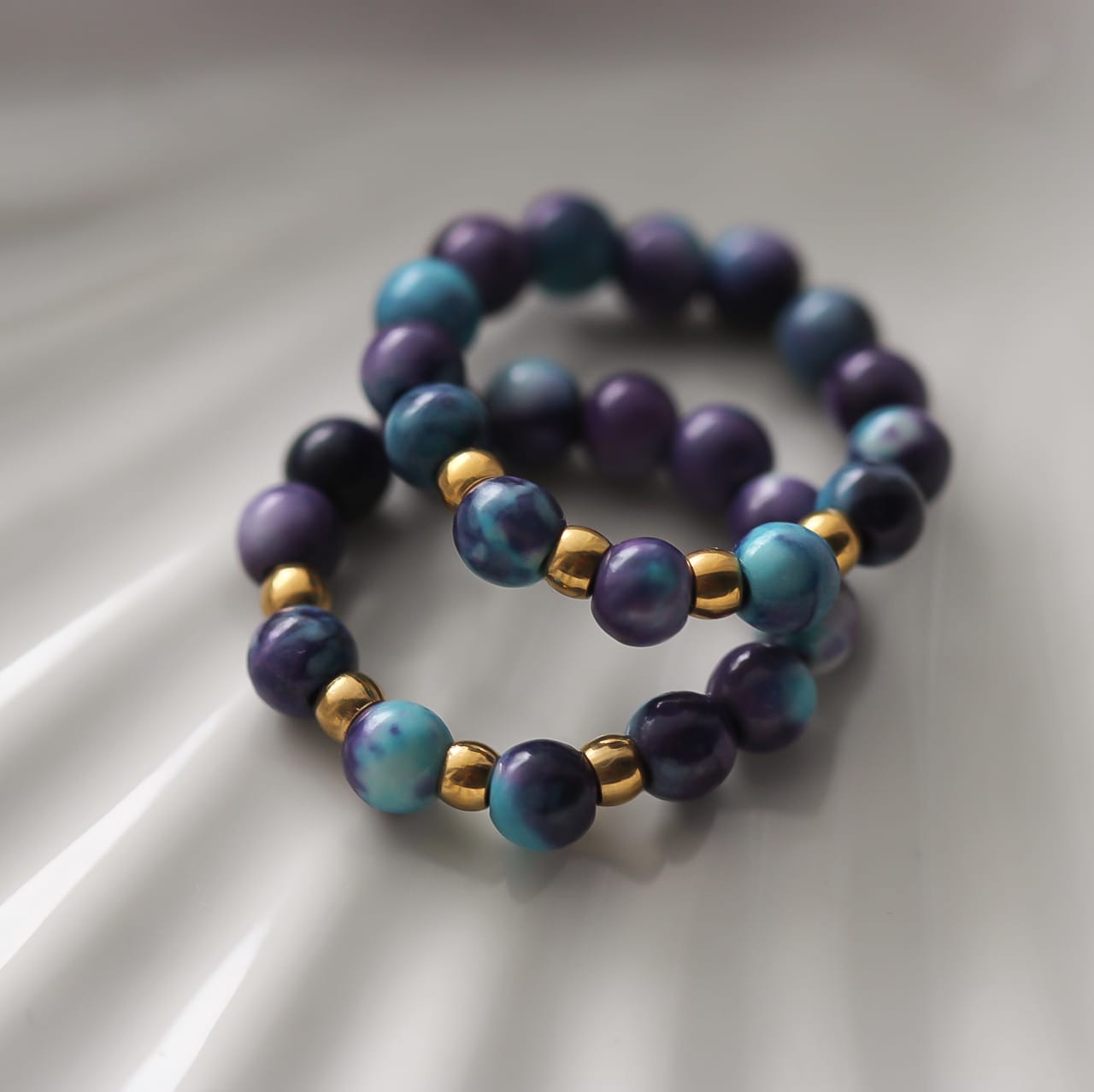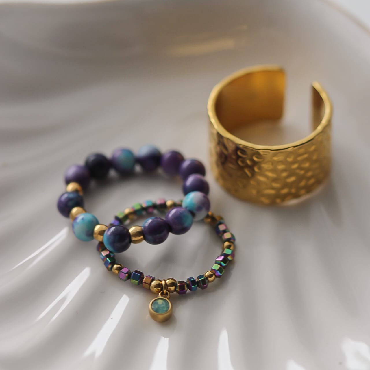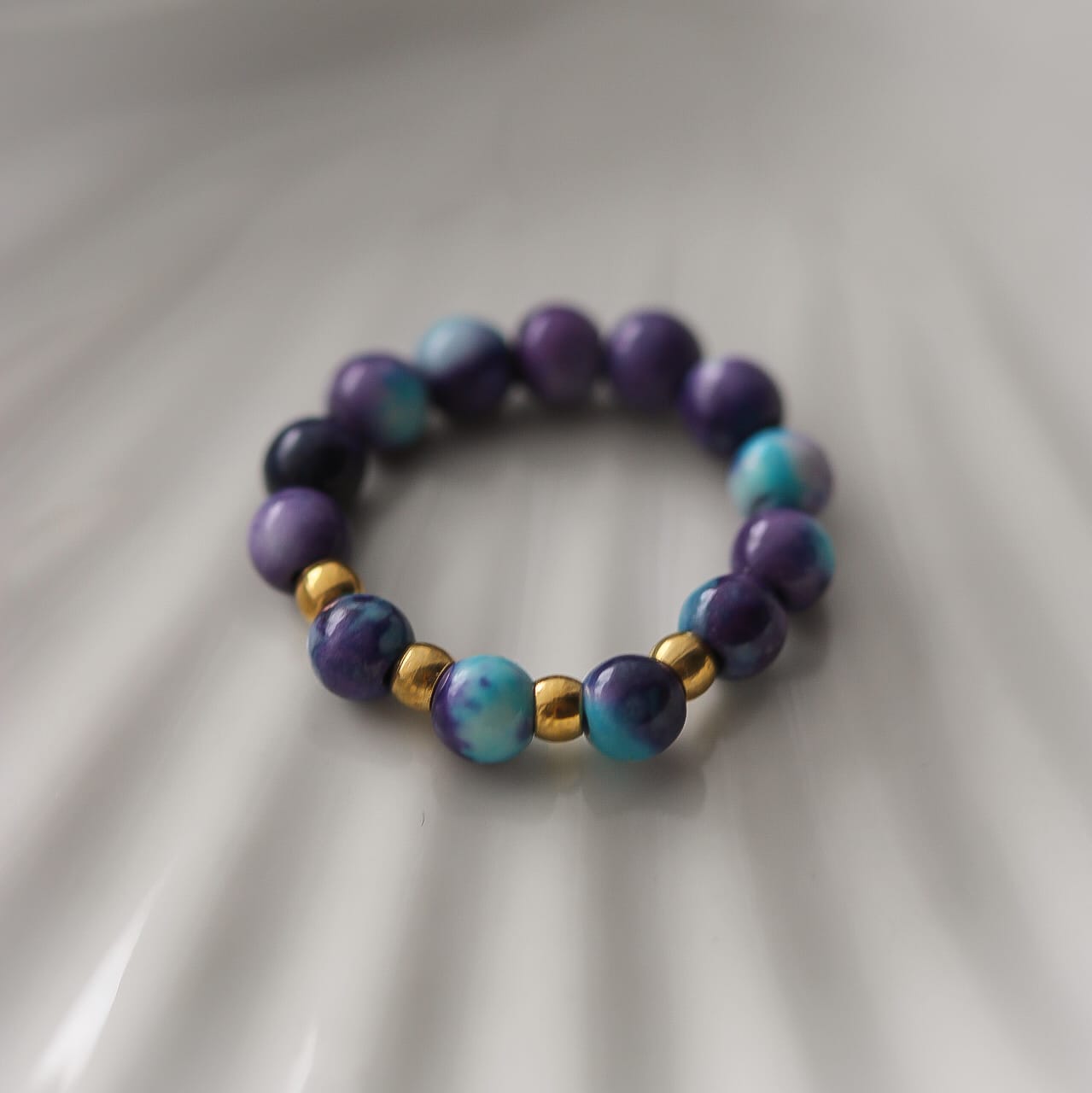 Elastischer Ring mit 4 mm Howlith-Perlen in Blau und Lila, kombiniert mit vergoldeten Edelstahlelementen. Leicht, farbenfroh und angenehm zu tragen.
