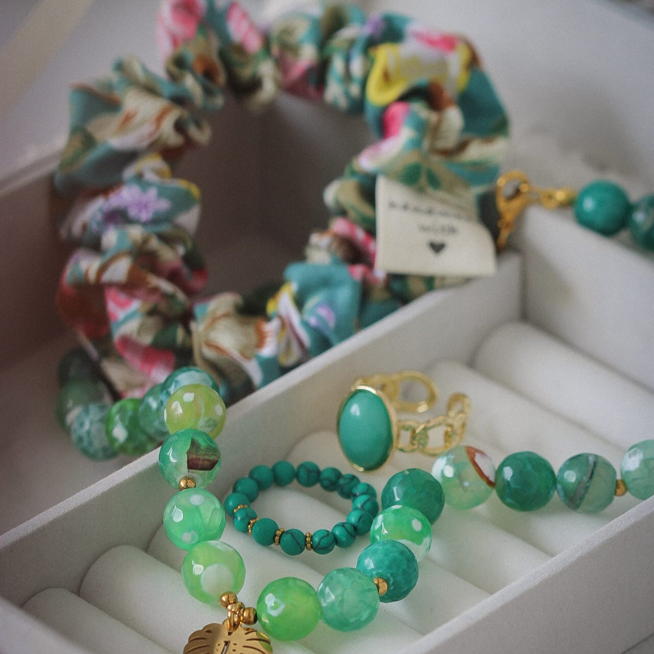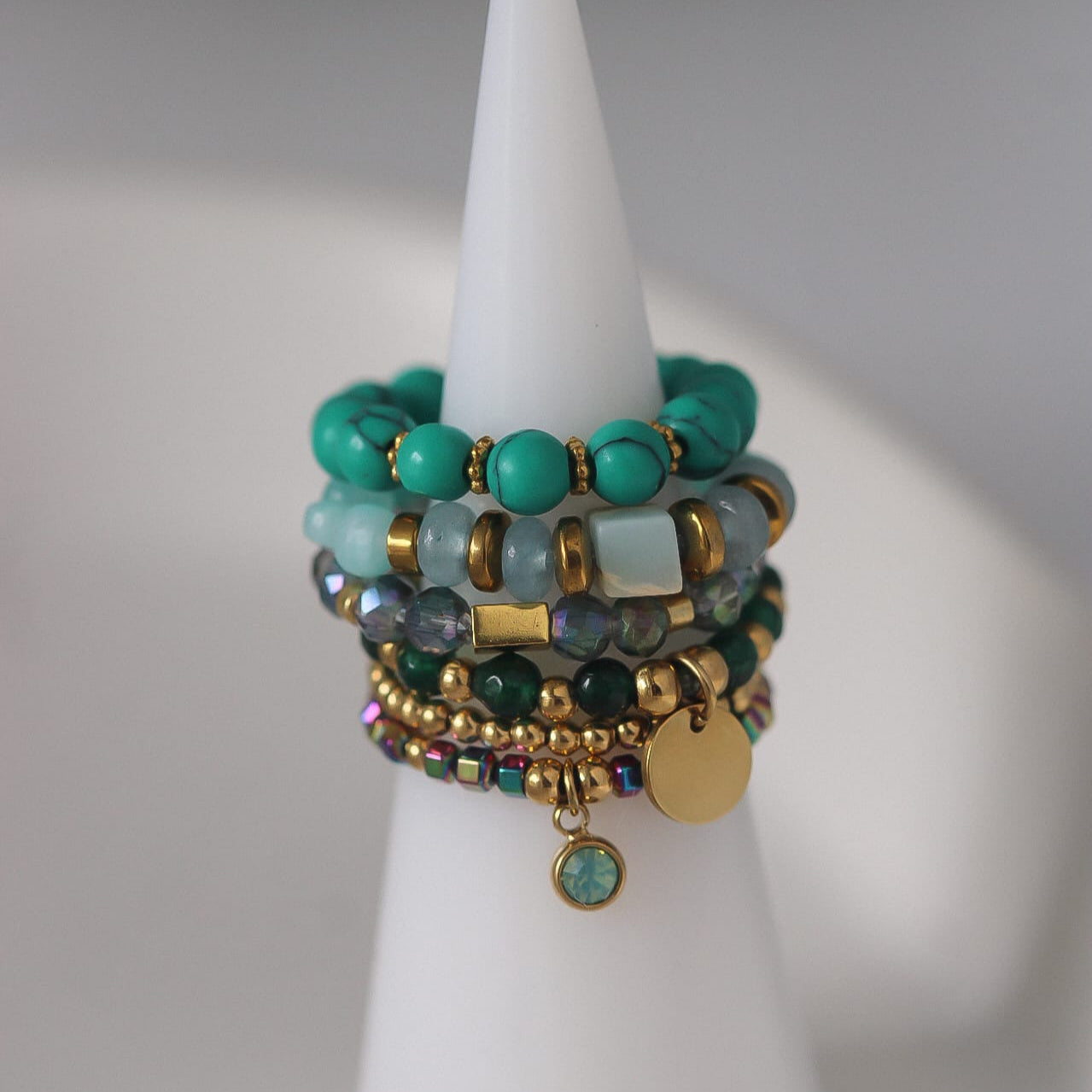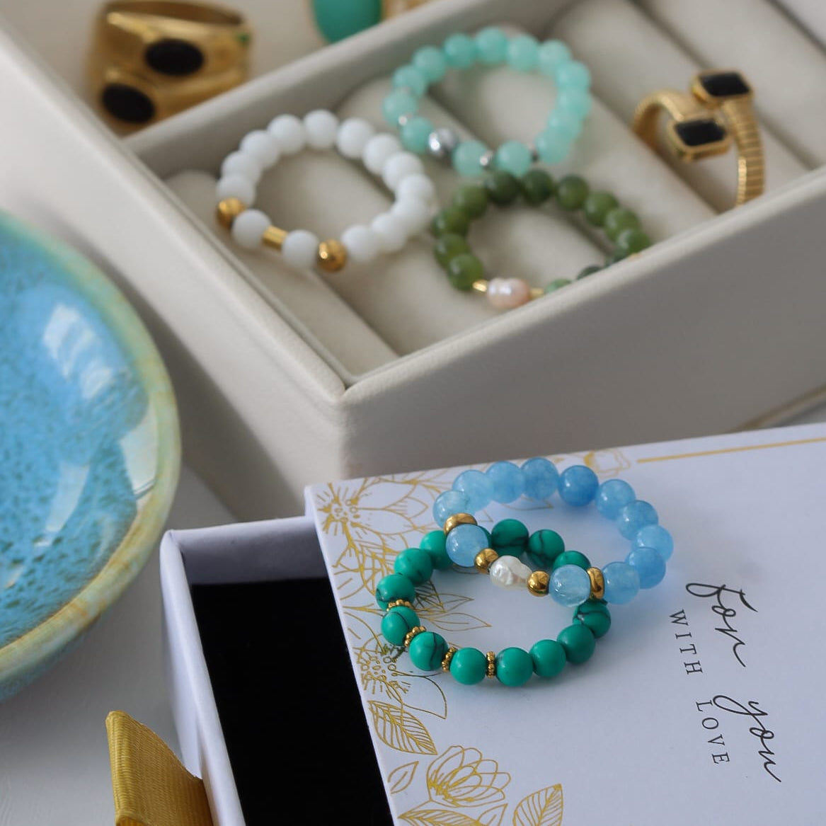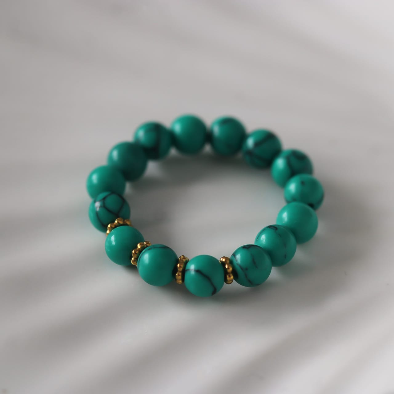 Elastischer Ring mit 4 mm grünen Türkis-Perlen, veredelt mit vergoldeten Edelstahlelementen. Elegant, zeitlos und angenehm zu tragen.
