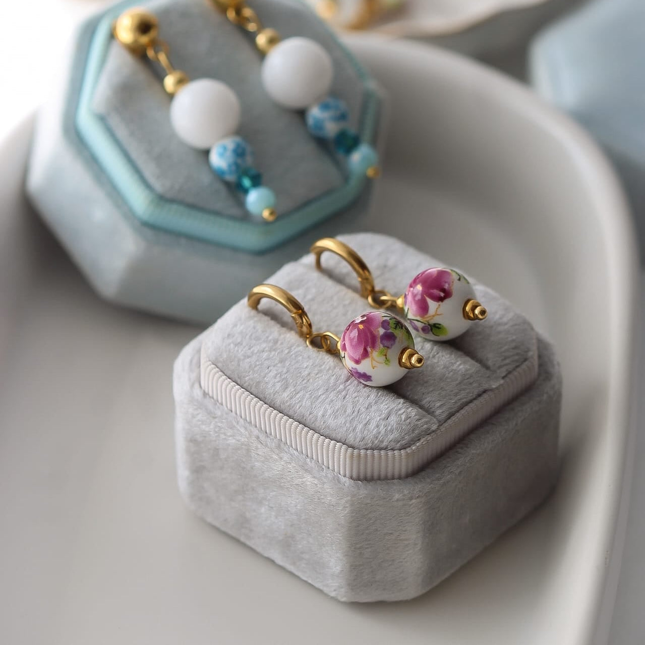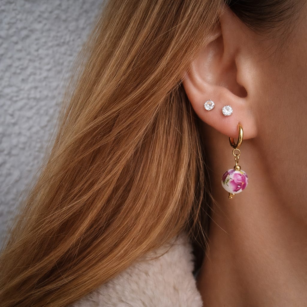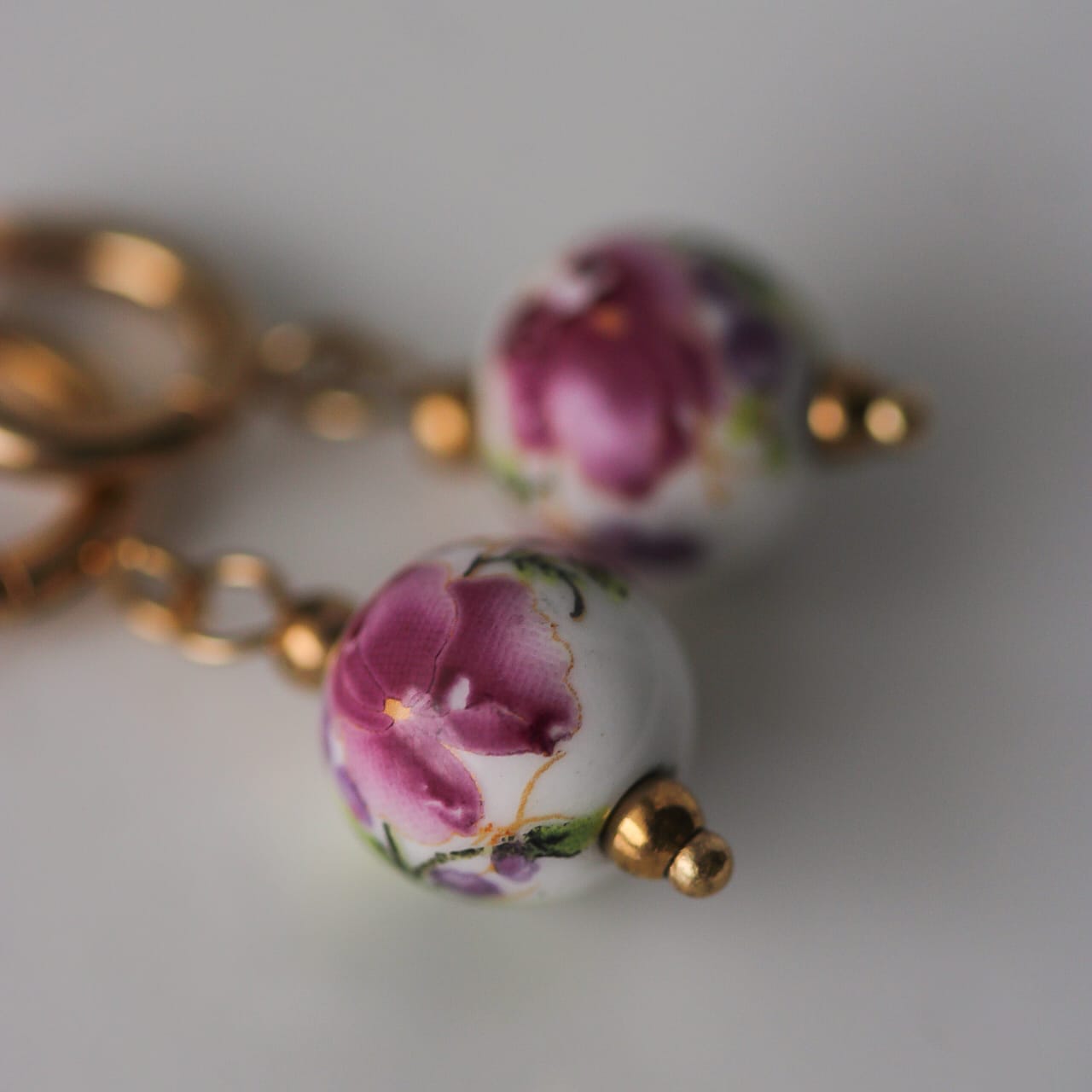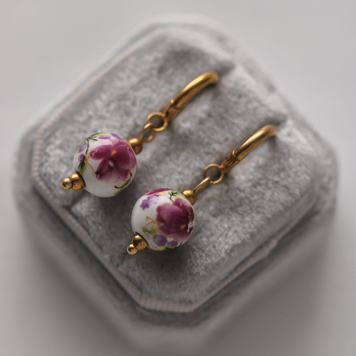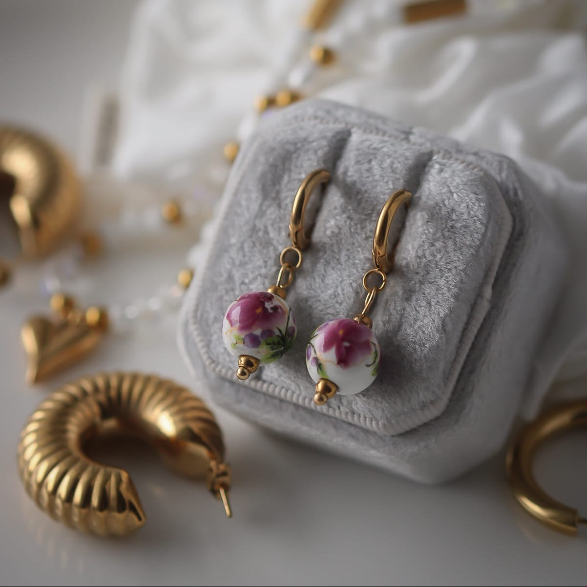 Vergoldete Ohrringe aus Edelstahl mit edler Porzellanperle im Vintage-Design mit rosa-lila Blumen. Ein ausdrucksstarkes Schmuckstück mit sanfter Eleganz und nostalgischem Charme.