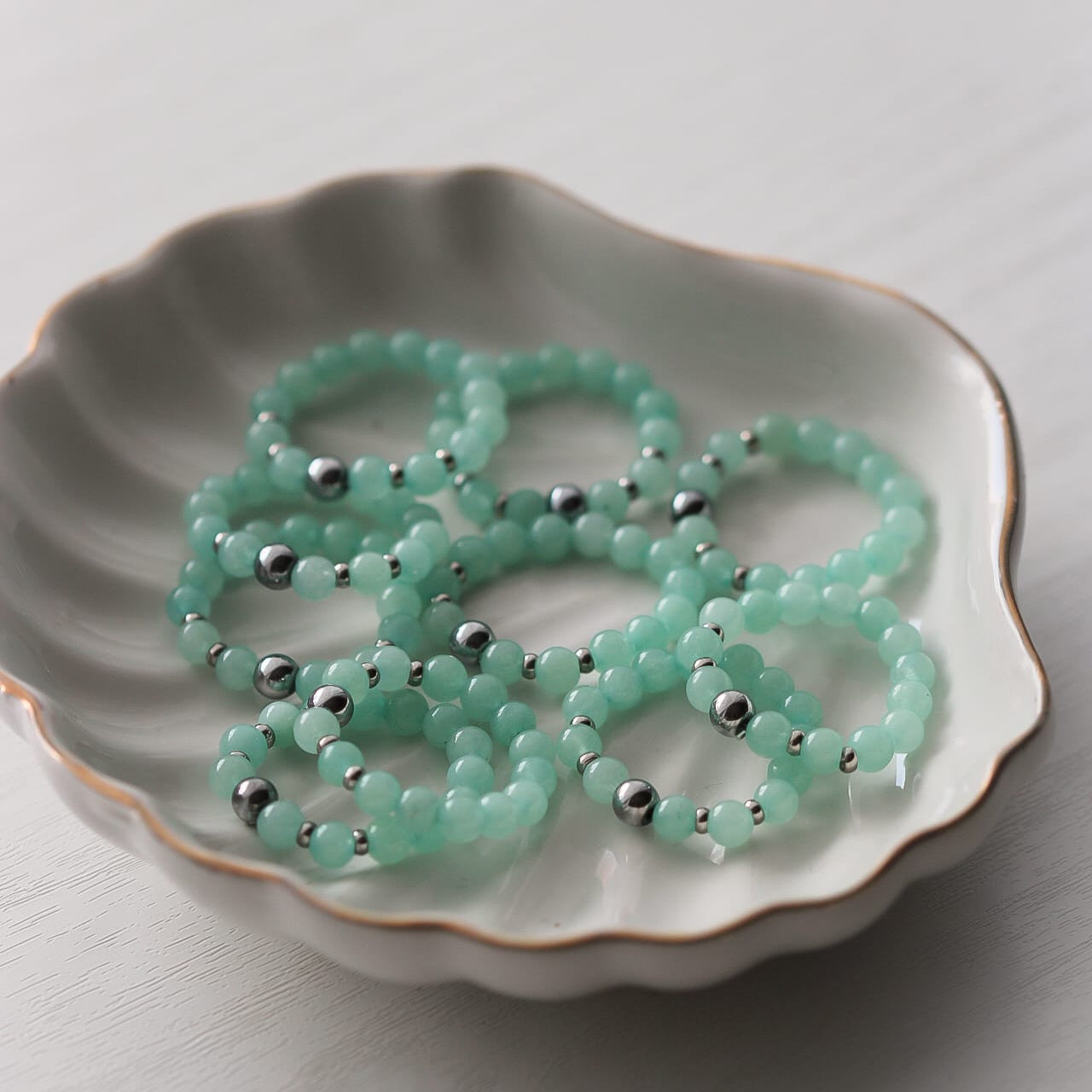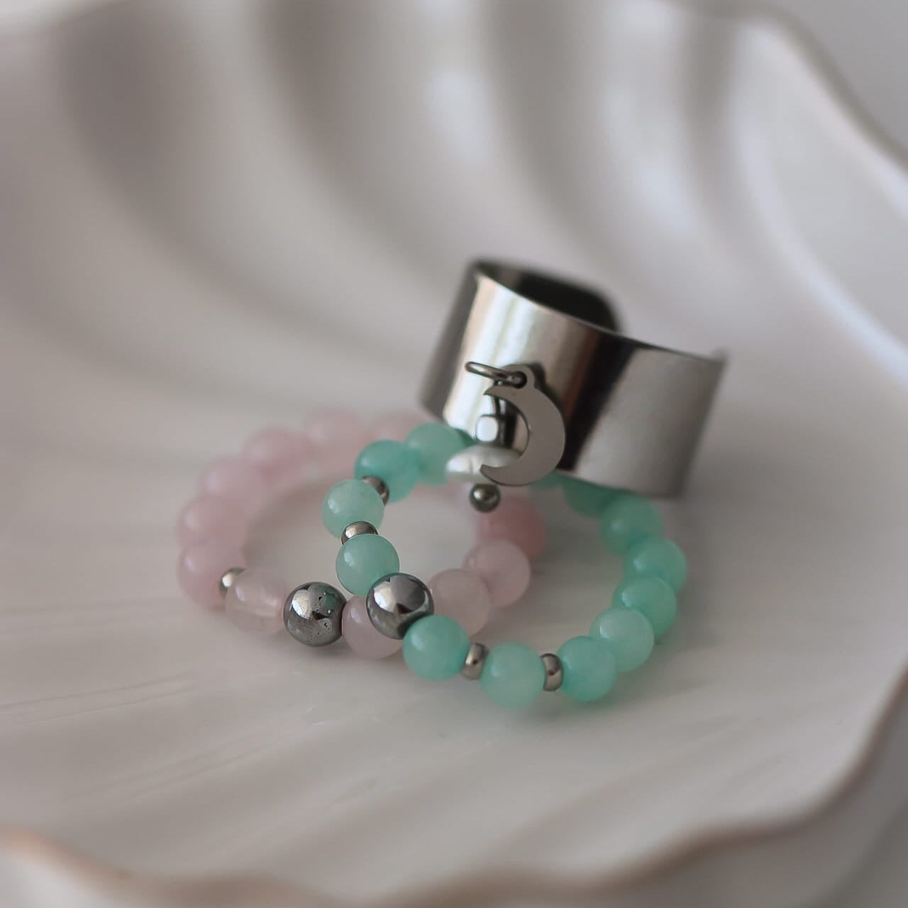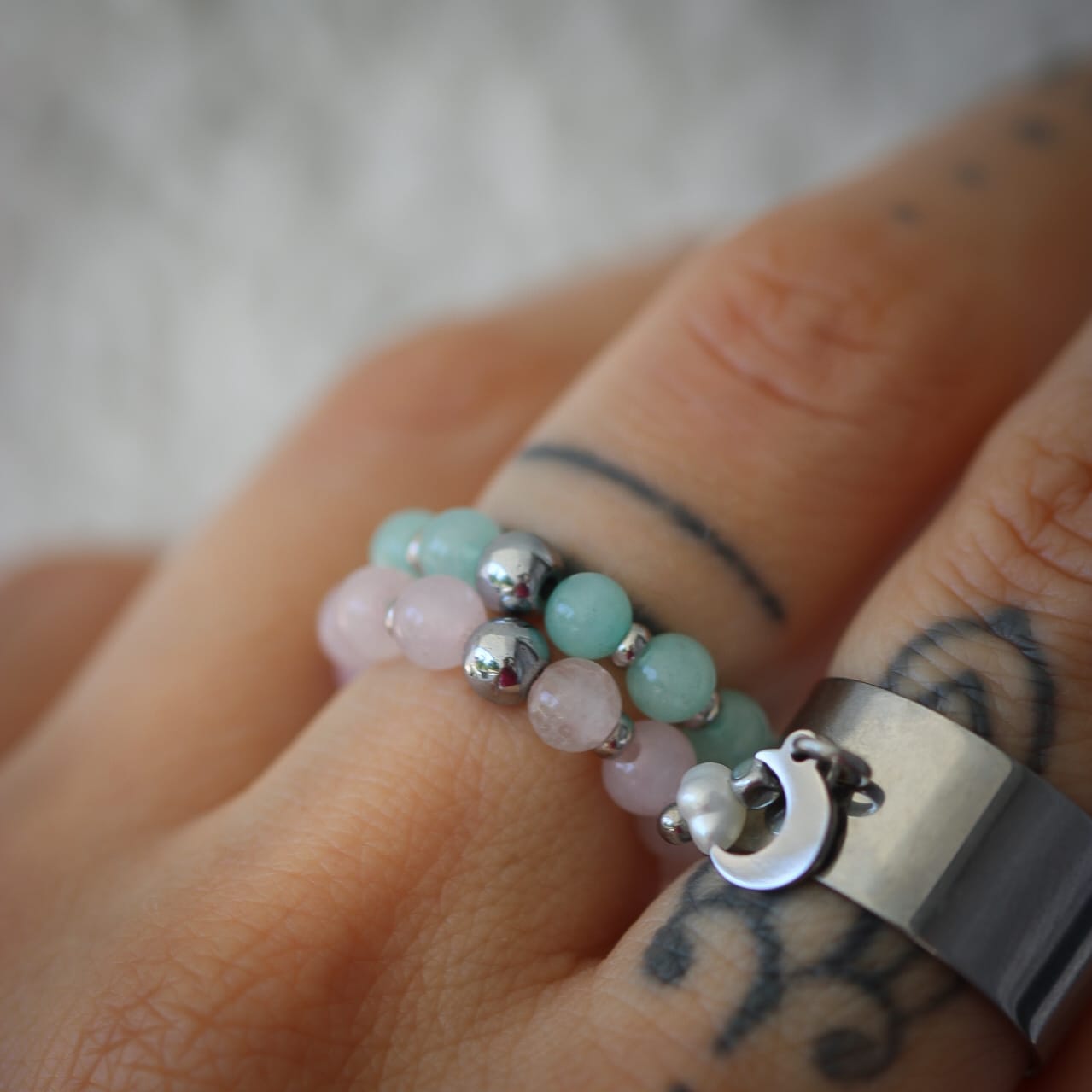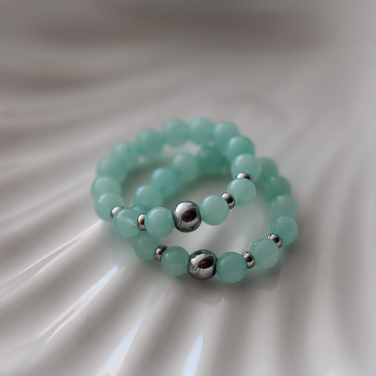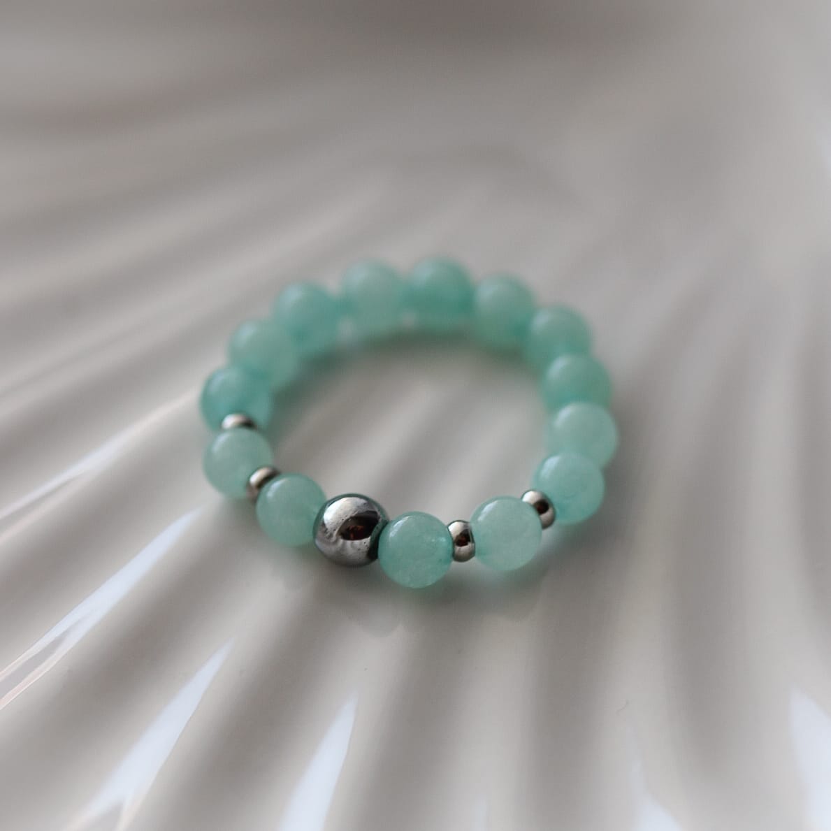 Elastischer Ring aus 4 mm großen Amazonit-Perlen, kombiniert mit schlichten Edelstahl-Elementen. Er passt sich flexibel der Fingergröße an und verleiht deinem Look eine natürliche, elegante Ausstrahlung.