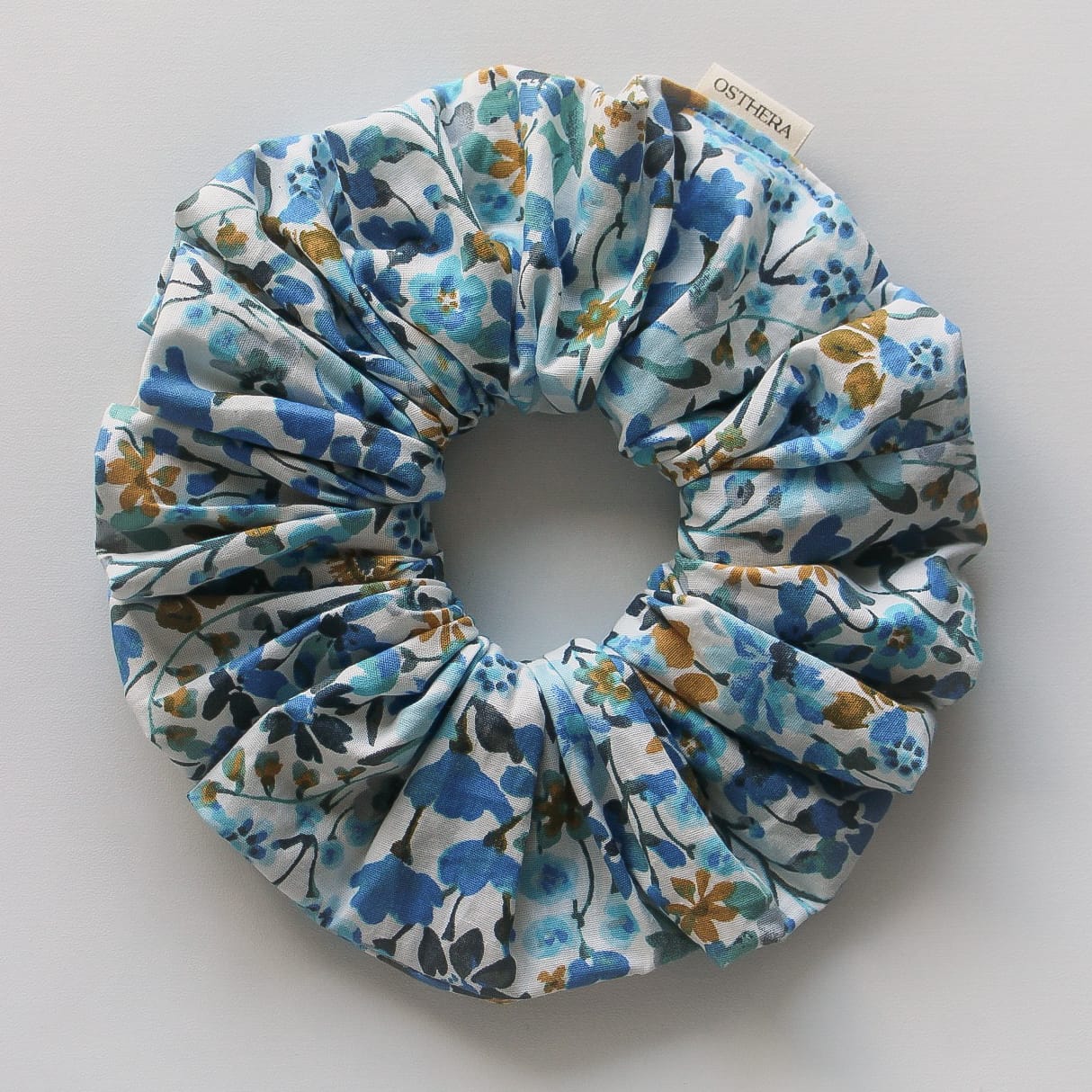 Scrunchie Orijana aus Baumwolle mit schönem blauen Blumenmuster im frischen, femininen Design. In Oversize-Größe gefertigt – perfekt für voluminöse Frisuren und stilvolle Looks.