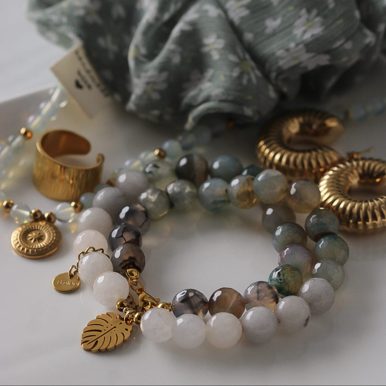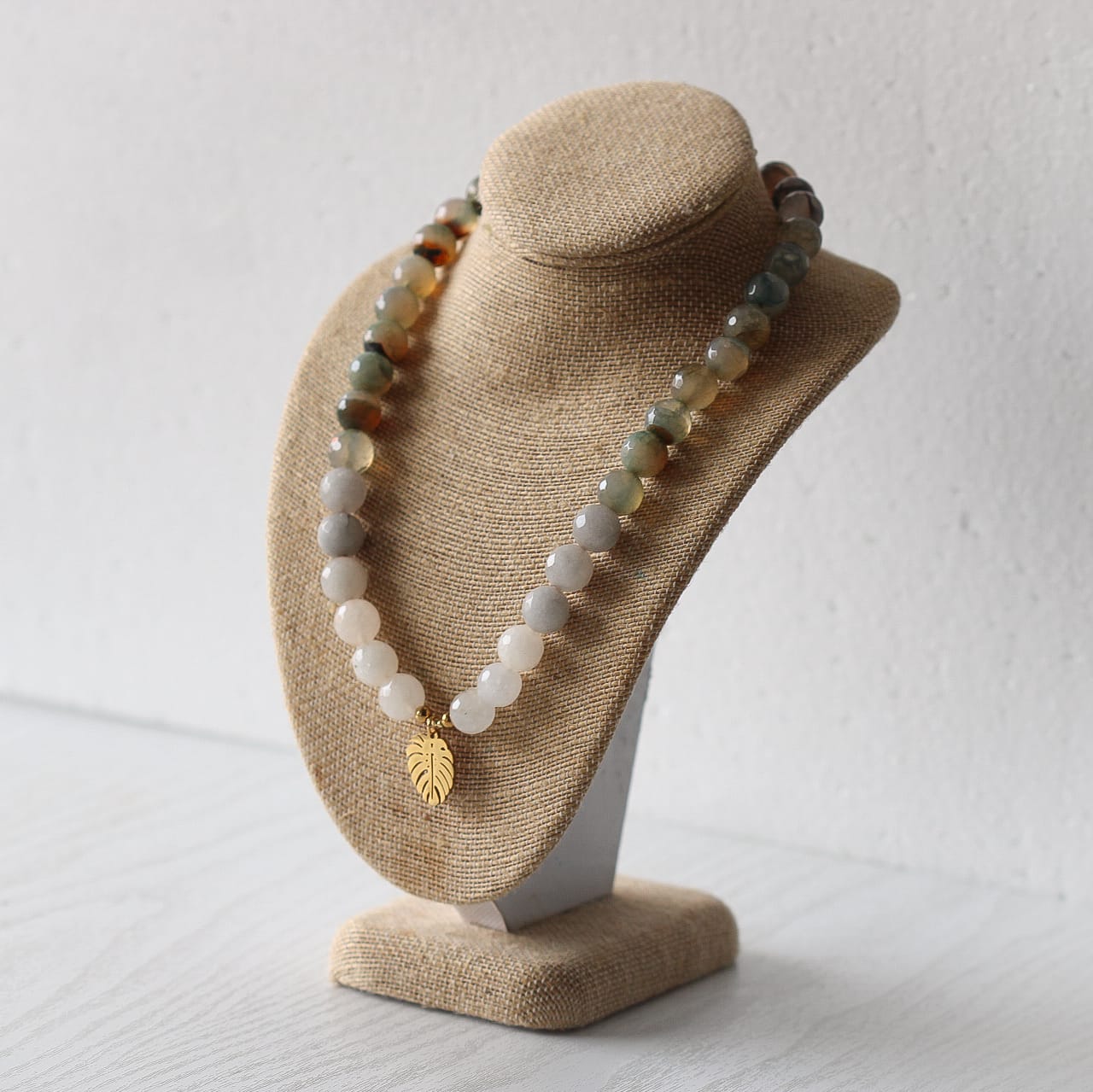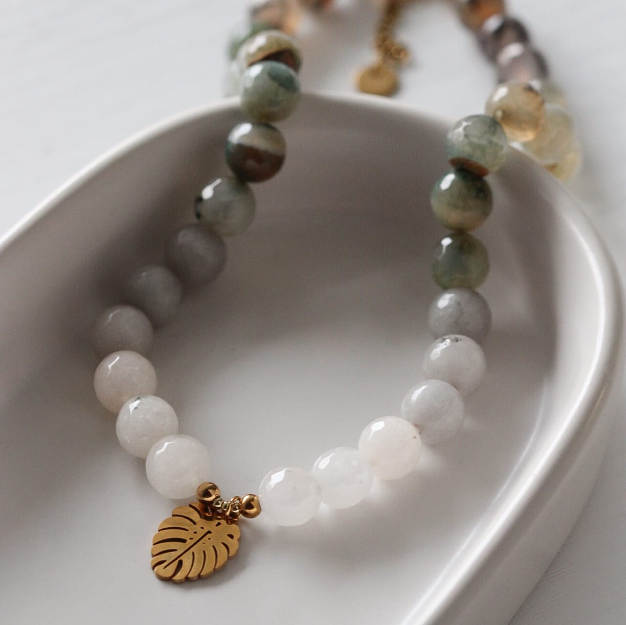 Elegante Halskette mit 10 mm Jade- und Achatsteinen in sanften Grau- und Grüntönen. Der vergoldete Edelstahlanhänger im Blatt-Design unterstreicht den natürlichen und modernen Charakter des Designs.