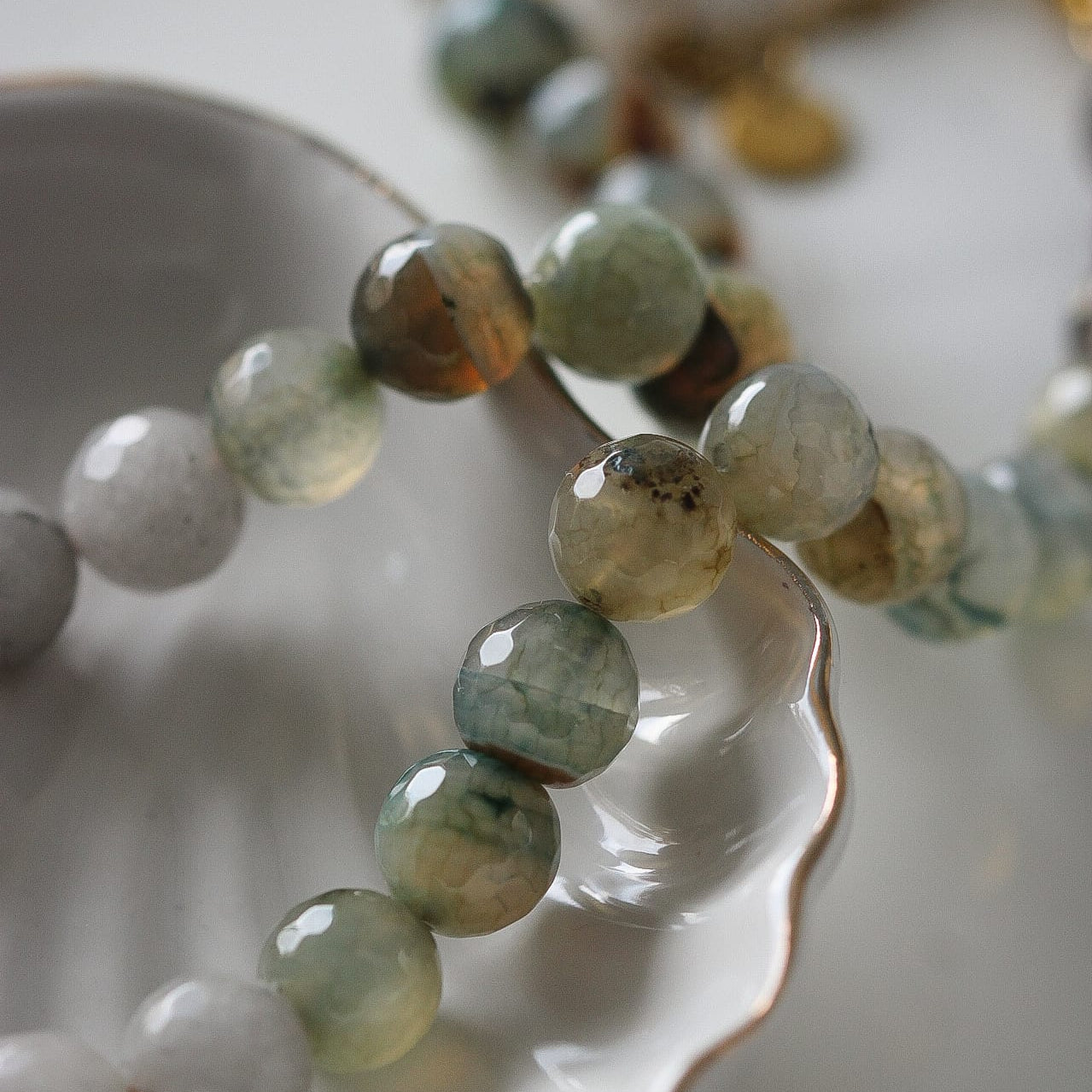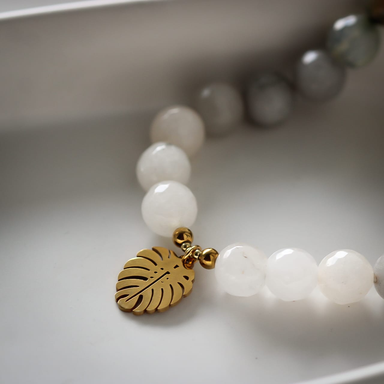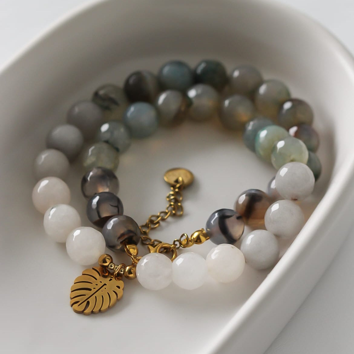 Elegante Halskette mit 10 mm Jade- und Achatsteinen in sanften Grau- und Grüntönen. Der vergoldete Edelstahlanhänger im Blatt-Design unterstreicht den natürlichen und modernen Charakter des Designs.